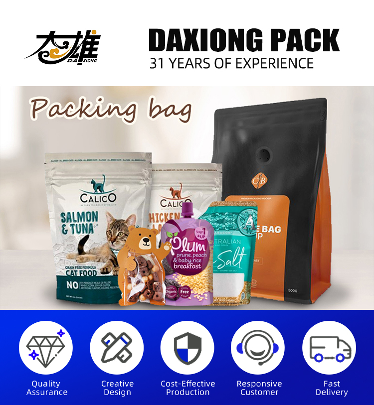 | Feature | Over 25 years experience in packaging manufacturingDaily production capacity reaches 0.1 billion bags 9 color gravure print the most vivid colors The bottom is self standing and thicker, using self standing stand design to makethe product stand more stable,strengthen the load bearing capacity not easy tofall down. | ||
